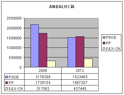 20-N obtuvo 41.959 votos más que en las autonómicas de 2008, y este 25-M otuvo 77.924 votos más que el 20-N), y PSOE obtuvo resultados muy similares el 20-N y el 25-M con un ligero ascenso (67.379 votos más en las autonómicas). Por otro lado, la variación de votos obtenidos por el PP es muy fluctuante, ya que en las autonómicas de 2008 obtuvo 1.730.154 votos, en las generales de 2011 consiguió 251.937 votos más, y en las autonómicas obtuvo 414.884 votos menos, rebajándose incluso las papeletas obtenidas en 2008 -162.947 votos-. Además, hay que tener en cuenta la fuerza que va alcanzando UPyD, que ha aumentado en 101.468 votos -aunque no le han servido para conseguir un escaño en el Parlamento andaluz-.