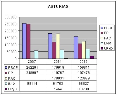 Por otro lado, entre 2011 y 2012 los tres grandes partidos en Asturias perdieron -en total- 86.151 votos, a la vez que IU-IX aumentó 7.124 votos y UPyD aumentó 17.275 -gracias a lo cual ha conseguido introducirse en el Parlamento de esta autonomía con un escaño-.